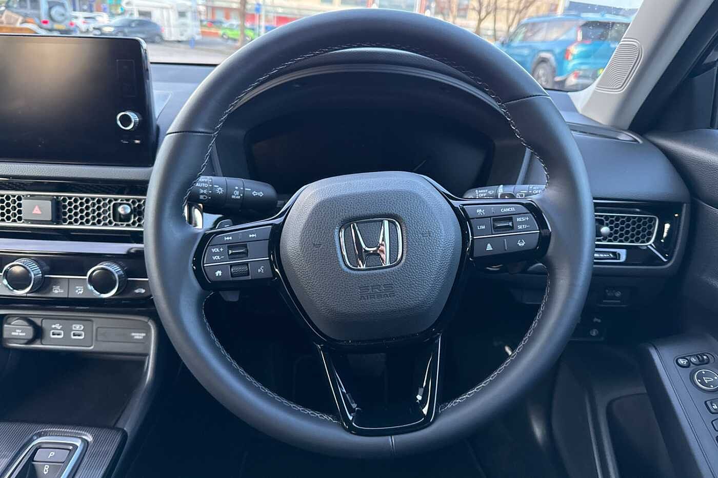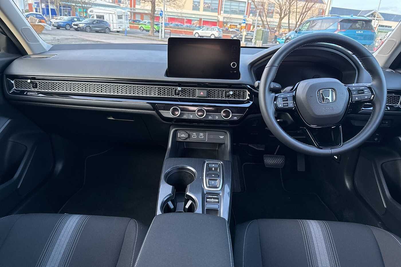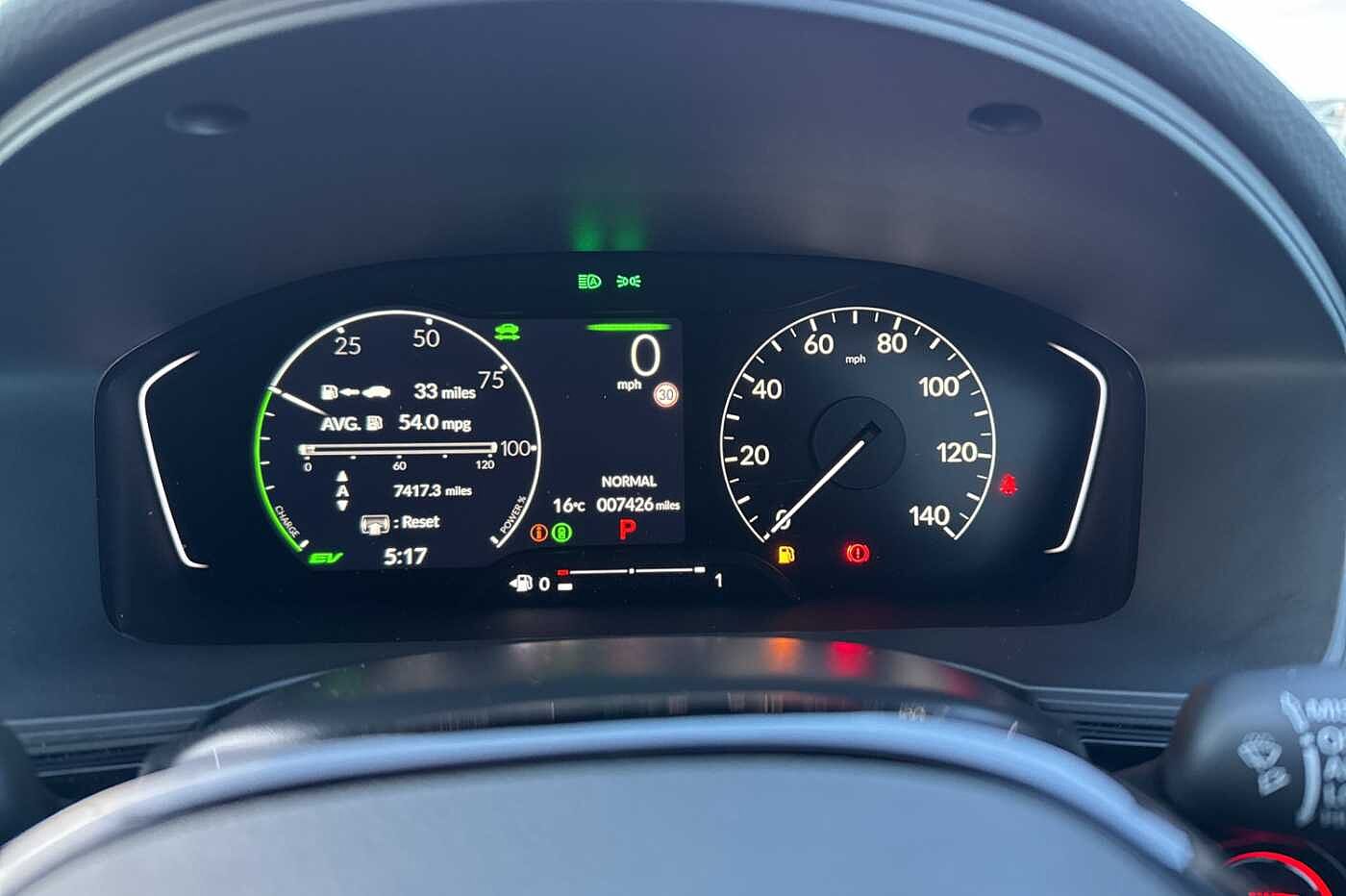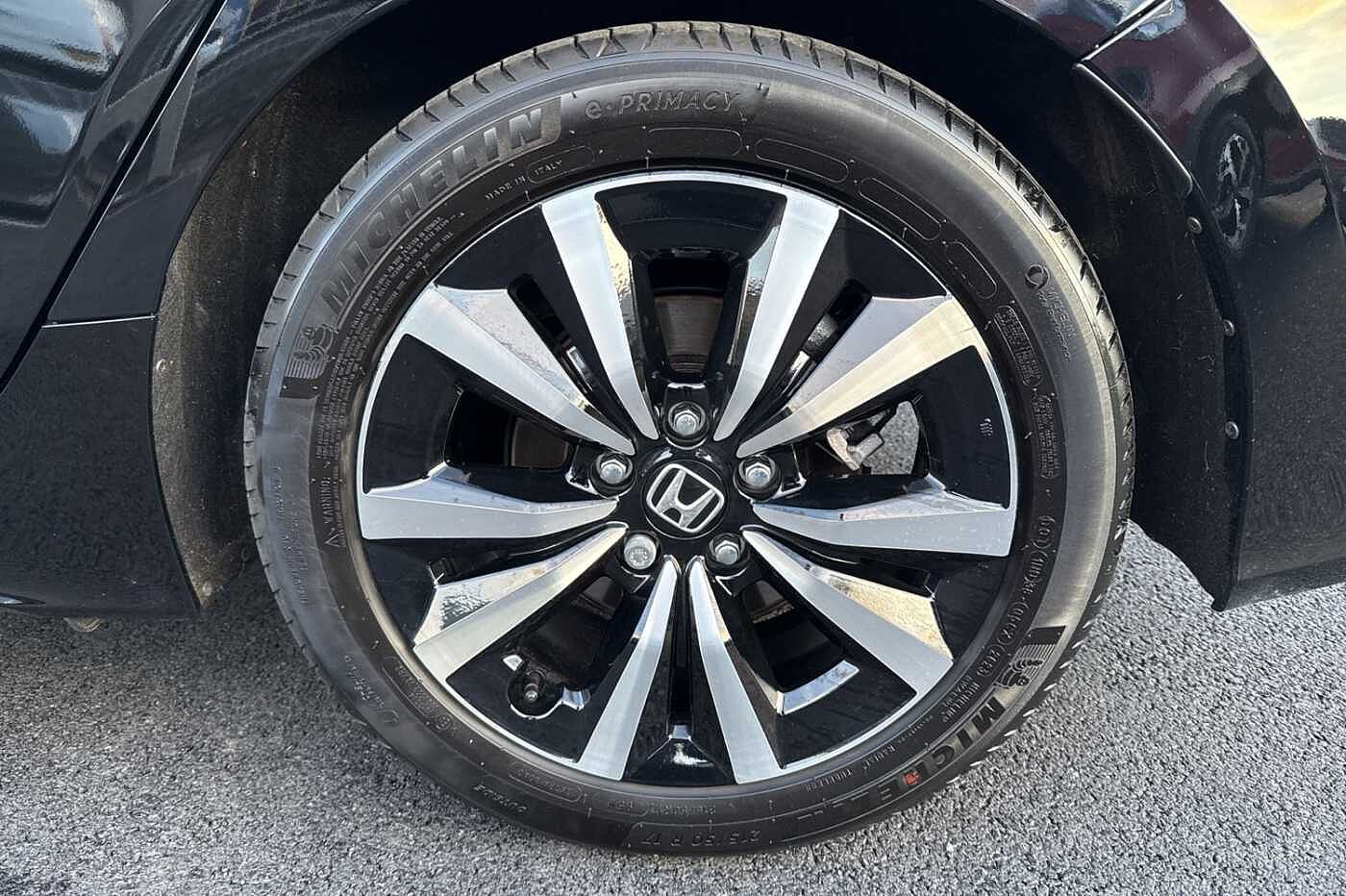 Exterior Features, Automatic rain sensing wipers, Electric front and rear windows, Privacy glass, Rear wiper, Variable front intermittent wipers, Vehicle stability assist, Body colour door handles, Chrome window garnish, Material finish grille, Pop up hood, Rear side wing doors, Single hidden exhaust pipe, Auto headlight adjuster, Auto headlights, Automatic coming/leaving home lighting function, Headlight extension black, High beam assist, High level LED brake light, LED daytime running lights, LED front turn type, LED Headlights, LED rear lights, Safety, ABS+EBD+Brake assist, Brake hold function, Collision mitigation braking system, Collision mitigation throttle control, Electronic parking brake with auto hold, Hill start assist, Low speed brake system, Regenerative braking/deceleration paddle control, Adaptive cruise control, Adaptive motion for electric power steering, Adjustable speed limiter, Agile handling assist, Driving modes, Electric power steering wheel with variable gear ratio steering, Emergency stop signalling system, Forward collision warning, Front and rear parking sensors, Honda sensing, Idle stop, Intelligent speed limiter, Lane departure warning system, Lane keep assist, Low speed following, Rear parking camera, Road departure mitigation, Traffic sign recognition, Aspherical driver door mirrors, Electric adjustable heated door mirrors, Electrically folding door mirrors, 3x3 point rear seatbelts, Airbags - driver and front passenger, Airbags - Knee (AS), Airbags - Knee (DR), Anti-whiplash front headrests, Deflation detection system, Driver SRS airbag (single stage inflation), Front and rear curtain airbags, Front and rear seat belts with emergency locking retractor (ELR), Front centre airbag, Front side airbags, Manual child lock in rear doors, Passenger airbag deactivate switch, Rear airbags, Audio / Communications, Bluetooth hands free telephone connection, Wireless apple carplay, 'Shark fin' mobile antenna, 2x USB Front socket (1 data & 1 charge), 8 speakers, Digital Audio Broadcast (DAB) Tuner, Front tweeters, Steering wheel mounted audio controls, Driver Convenience, Power meter, Tailgate, Miscellaneous, 7" Multi information display screen, BLIS (Blind Spot Information System) with Cross Traffic Monitor, Economy mode, Emergency call service, Honda CONNECT with Navigation 9" touchscreen, AM/FM/DAB, Apple Carplay and Android Auto, live traffic info, Traffic jam assist, Interior Features, Dual climate control air conditioning system, Cargo accessory power socket, Cargo net hooks, Driver and front passenger seat armrests, Fabric upholstery, Front accessory power socket, Hybrid emblem, Leather steering wheel, Platinum chrome interior door handles, Rear seat centre armrest, Tilt/telescopic adjustable steering wheel, Tonneau cover, USB Rear number 2 x charge, Front map lights, Front/rear courtesy lights, Glovebox light, Meter Illumination white, Rear reading lights, Trunk light, White ambient roof light, Sunvisors with illuminated vanity mirrors, Trim, 3 seat bench in 2nd row, 60/40 split folding rear seat, Driver's electric lumbar adjustment, Driver's seat height adjustment, Heated front seats, Isofix points/i size, Passenger seat back pocket, Rear head restraints, Single front passenger seat, Security, Immobiliser, Mirrors and windows key fob, Remote central locking with 2 jack knife keys, Security alarm, Selectable door unlock, Smart entry + Smart start, Superlocking, Tilt sensors, Ultrasonic security sensor, Wheels, 17" 2 tone diamond cut alloy wheels, Tyre repair kit