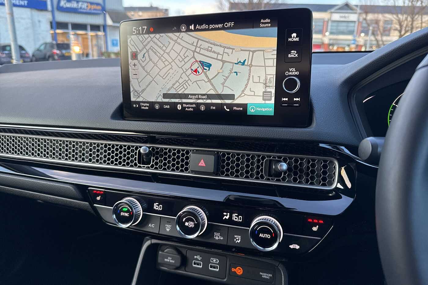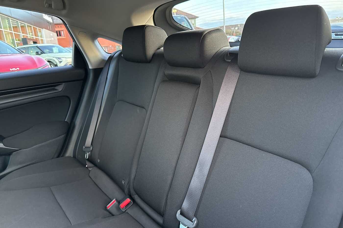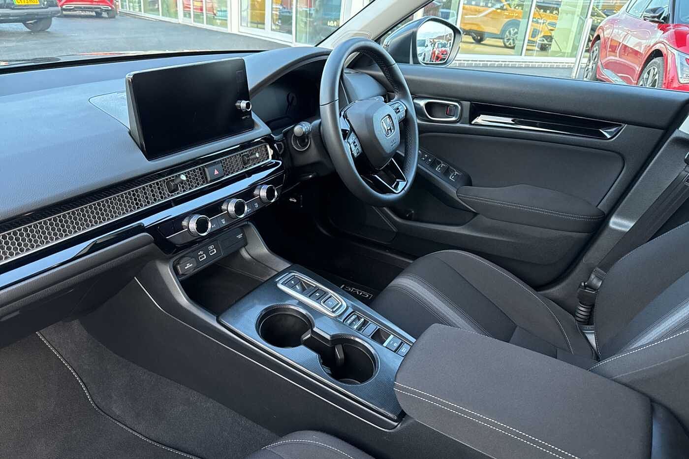 Exterior Features, Automatic rain sensing wipers, Electric front and rear windows, Privacy glass, Rear wiper, Variable front intermittent wipers, Vehicle stability assist, Body colour door handles, Chrome window garnish, Material finish grille, Pop up hood, Rear side wing doors, Single hidden exhaust pipe, Auto headlight adjuster, Auto headlights, Automatic coming/leaving home lighting function, Headlight extension black, High beam assist, High level LED brake light, LED daytime running lights, LED front turn type, LED Headlights, LED rear lights, Safety, ABS+EBD+Brake assist, Brake hold function, Collision mitigation braking system, Collision mitigation throttle control, Electronic parking brake with auto hold, Hill start assist, Low speed brake system, Regenerative braking/deceleration paddle control, Adaptive cruise control, Adaptive motion for electric power steering, Adjustable speed limiter, Agile handling assist, Driving modes, Electric power steering wheel with variable gear ratio steering, Emergency stop signalling system, Forward collision warning, Front and rear parking sensors, Honda sensing, Idle stop, Intelligent speed limiter, Lane departure warning system, Lane keep assist, Low speed following, Rear parking camera, Road departure mitigation, Traffic sign recognition, Aspherical driver door mirrors, Electric adjustable heated door mirrors, Electrically folding door mirrors, 3x3 point rear seatbelts, Airbags - driver and front passenger, Airbags - Knee (AS), Airbags - Knee (DR), Anti-whiplash front headrests, Deflation detection system, Driver SRS airbag (single stage inflation), Front and rear curtain airbags, Front and rear seat belts with emergency locking retractor (ELR), Front centre airbag, Front side airbags, Manual child lock in rear doors, Passenger airbag deactivate switch, Rear airbags, Audio / Communications, Bluetooth hands free telephone connection, Wireless apple carplay, 'Shark fin' mobile antenna, 2x USB Front socket (1 data & 1 charge), 8 speakers, Digital Audio Broadcast (DAB) Tuner, Front tweeters, Steering wheel mounted audio controls, Driver Convenience, Power meter, Tailgate, Miscellaneous, 7" Multi information display screen, BLIS (Blind Spot Information System) with Cross Traffic Monitor, Economy mode, Emergency call service, Honda CONNECT with Navigation 9" touchscreen, AM/FM/DAB, Apple Carplay and Android Auto, live traffic info, Traffic jam assist, Interior Features, Dual climate control air conditioning system, Cargo accessory power socket, Cargo net hooks, Driver and front passenger seat armrests, Fabric upholstery, Front accessory power socket, Hybrid emblem, Leather steering wheel, Platinum chrome interior door handles, Rear seat centre armrest, Tilt/telescopic adjustable steering wheel, Tonneau cover, USB Rear number 2 x charge, Front map lights, Front/rear courtesy lights, Glovebox light, Meter Illumination white, Rear reading lights, Trunk light, White ambient roof light, Sunvisors with illuminated vanity mirrors, Trim, 3 seat bench in 2nd row, 60/40 split folding rear seat, Driver's electric lumbar adjustment, Driver's seat height adjustment, Heated front seats, Isofix points/i size, Passenger seat back pocket, Rear head restraints, Single front passenger seat, Security, Immobiliser, Mirrors and windows key fob, Remote central locking with 2 jack knife keys, Security alarm, Selectable door unlock, Smart entry + Smart start, Superlocking, Tilt sensors, Ultrasonic security sensor, Wheels, 17" 2 tone diamond cut alloy wheels, Tyre repair kit