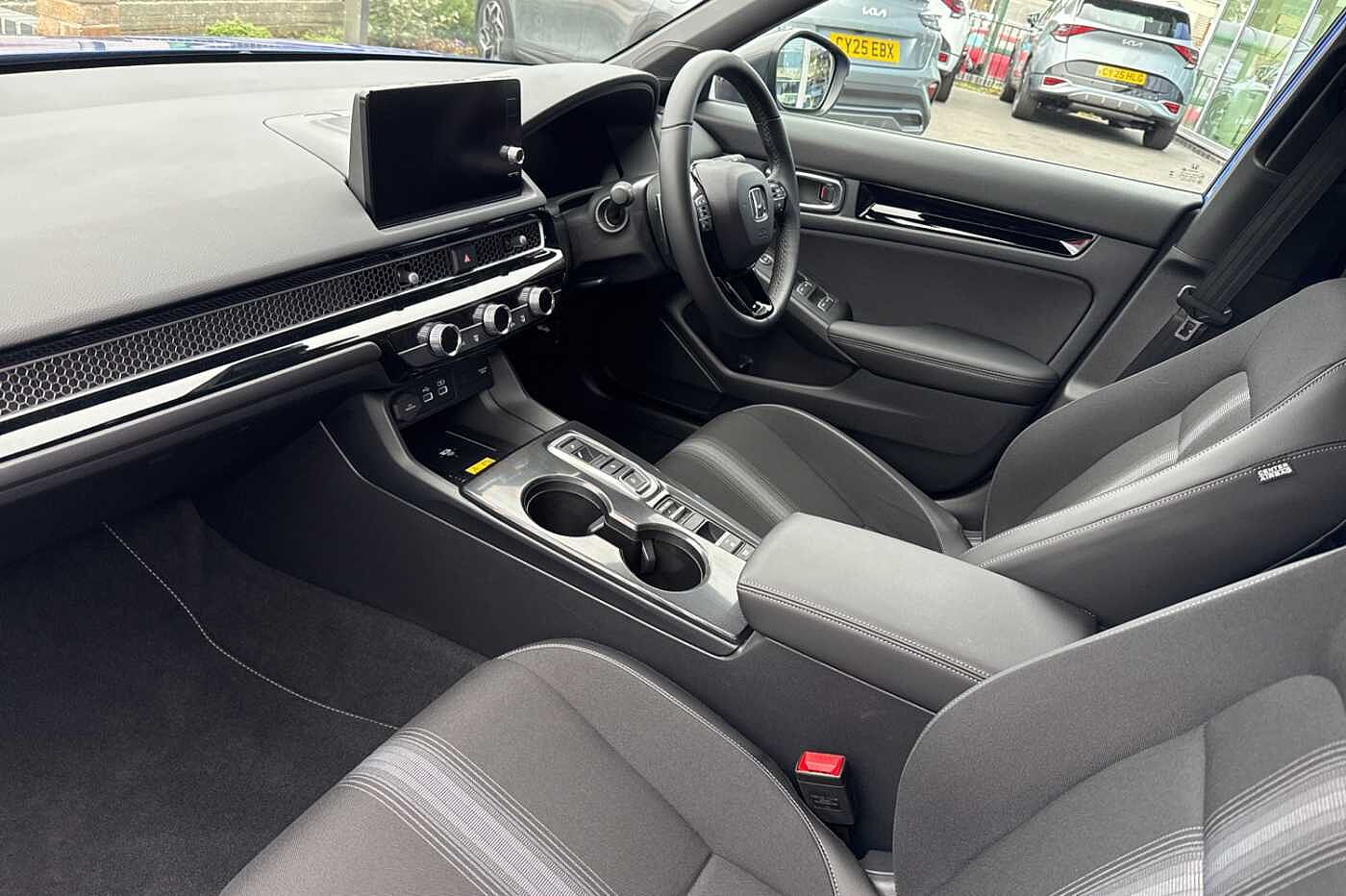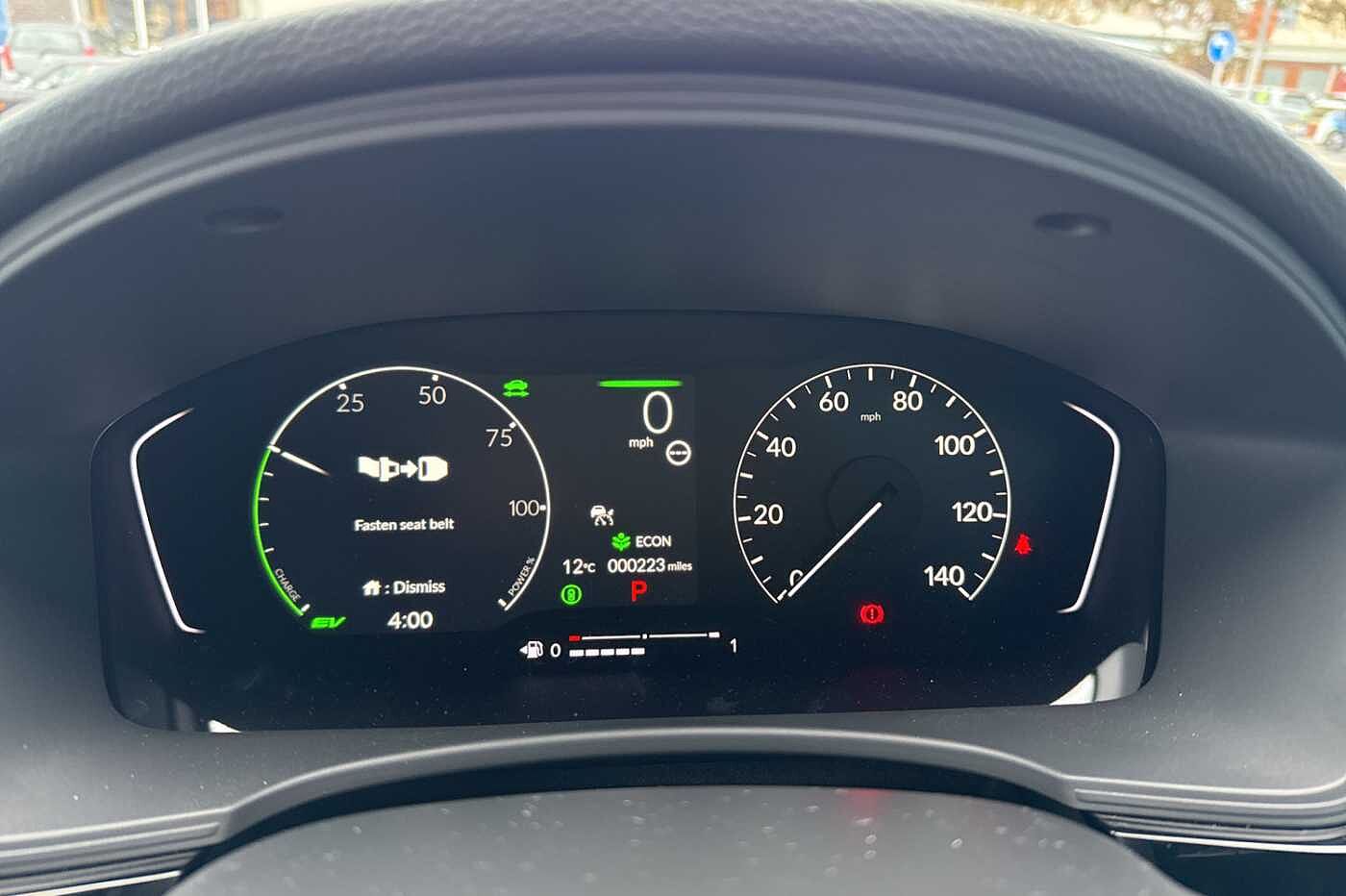 Exterior Features, Automatic rain sensing wipers, Electric front and rear windows, Privacy glass, Rear wiper, Variable front intermittent wipers, Vehicle stability assist, Black window frames, Body colour door handles, Low gloss black window garnish, Material finish grille, Pop up hood, Rear side wing doors, Single hidden exhaust pipe, Auto headlight adjuster, Auto headlights, Automatic coming/leaving home lighting function, Headlight extension black, High beam assist, High level LED brake light, LED daytime running lights, LED front fog lights, LED front turn type, LED Headlights, LED rear lights, Safety, ABS+EBD+Brake assist, Brake hold function, Collision mitigation braking system, Collision mitigation throttle control, Electronic parking brake with auto hold, Hill start assist, Low speed brake system, Regenerative braking/deceleration paddle control, Adaptive cruise control, Adaptive motion for electric power steering, Adjustable speed limiter, Agile handling assist, Driving modes, Electric power steering wheel with variable gear ratio steering, Emergency stop signalling system, Forward collision warning, Front and rear parking sensors, Honda sensing, Idle stop, Intelligent speed limiter, Lane departure warning system, Lane keep assist, Low speed following, Rear parking camera, Road departure mitigation, Traffic sign recognition, Aspherical driver door mirrors, Auto dimming rear view mirror, Electric adjustable heated door mirrors, Electrically folding door mirrors, 3x3 point rear seatbelts, Airbags - driver and front passenger, Airbags - Knee (AS), Airbags - Knee (DR), Anti-whiplash front headrests, Deflation detection system, Driver SRS airbag (single stage inflation), Front and rear curtain airbags, Front and rear seat belts with emergency locking retractor (ELR), Front centre airbag, Front side airbags, Manual child lock in rear doors, Passenger airbag deactivate switch, Rear airbags, Audio / Communications, Bluetooth hands free telephone connection, Wireless apple carplay, 'Shark fin' mobile antenna, 2x USB Front socket (1 data & 1 charge), 8 Speakers, Digital Audio Broadcast (DAB) Tuner, Front tweeters, Steering wheel mounted audio controls, Driver Convenience, Power meter, Tailgate, Miscellaneous, 7" Multi information display screen, BLIS (Blind Spot Information System) with Cross Traffic Monitor, Economy mode, Emergency call service, Honda CONNECT with Navigation 9" touchscreen, AM/FM/DAB, Apple Carplay and Android Auto, live traffic info, Smartphone wireless charging plate, Traffic jam assist, Interior Features, Dual climate control air conditioning system, Rear air vents, Cargo accessory power socket, Cargo net hooks, Driver and front passenger seat armrests, Fabric/synthetic leather upholstery, Front accessory power socket, Hybrid emblem, Leather steering wheel, Platinum chrome interior door handles, Rear seat centre armrest, Stainless steel sports pedals, Tilt/telescopic adjustable steering wheel, Tonneau cover, USB Rear number 2 x charge, Front map lights, Front/rear courtesy lights, Glovebox light, Meter Illumination white, Rear reading lights, Trunk light, White ambient roof light, Sunvisors with illuminated vanity mirrors, Trim, 3 seat bench in 2nd row, 60/40 split folding rear seat, Driver's electric lumbar adjustment, Driver's seat height adjustment, Heated front seats, Isofix points/i size, Passenger seat back pocket, Rear head restraints, Single front passenger seat, Security, Immobiliser, Mirrors and windows key fob, Remote central locking with 2 jack knife keys, Security alarm, Selectable door unlock, Smart entry + Smart start, Superlocking, Tilt sensors, Ultrasonic security sensor, Wheels, Tyre repair kit