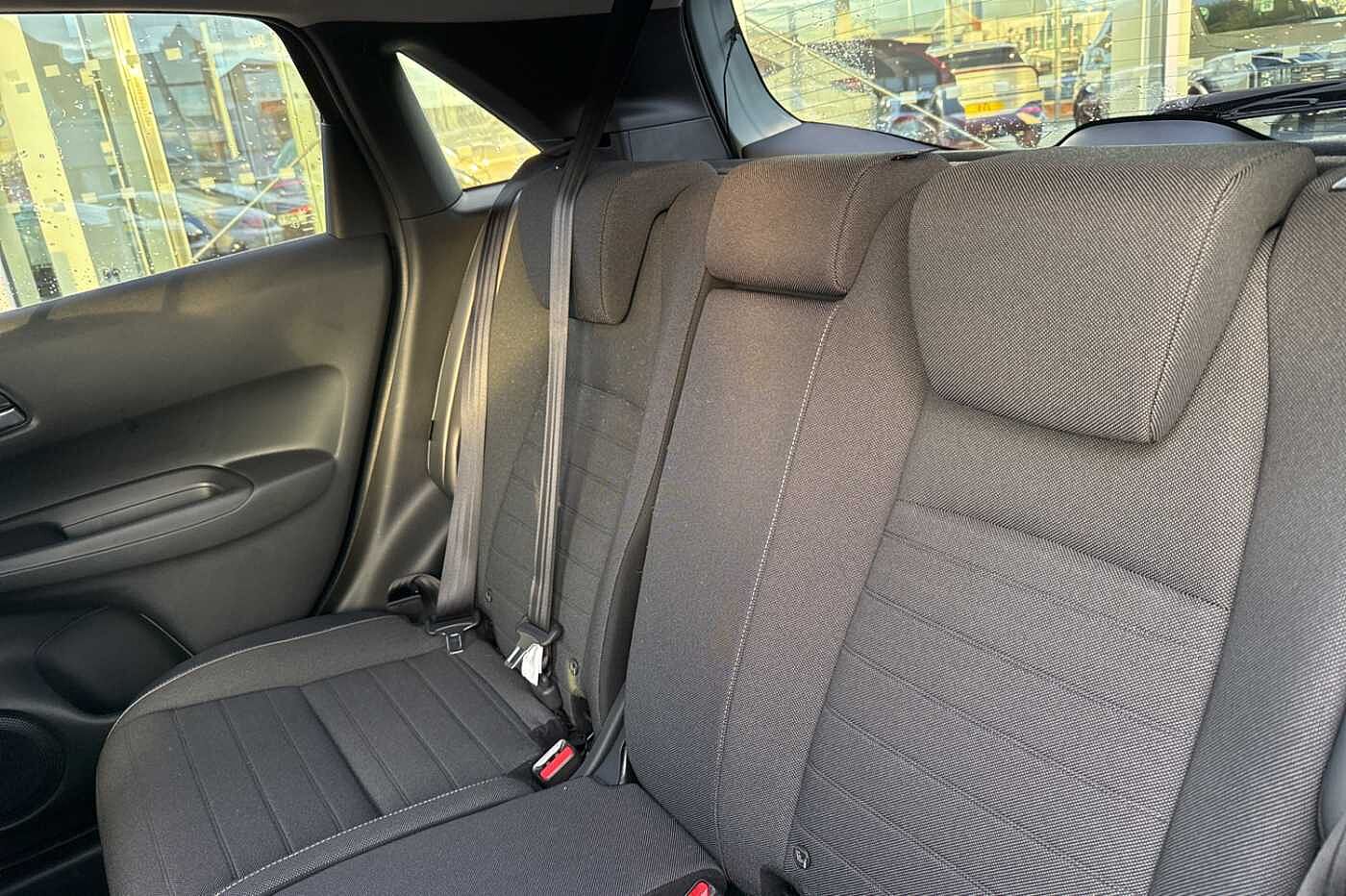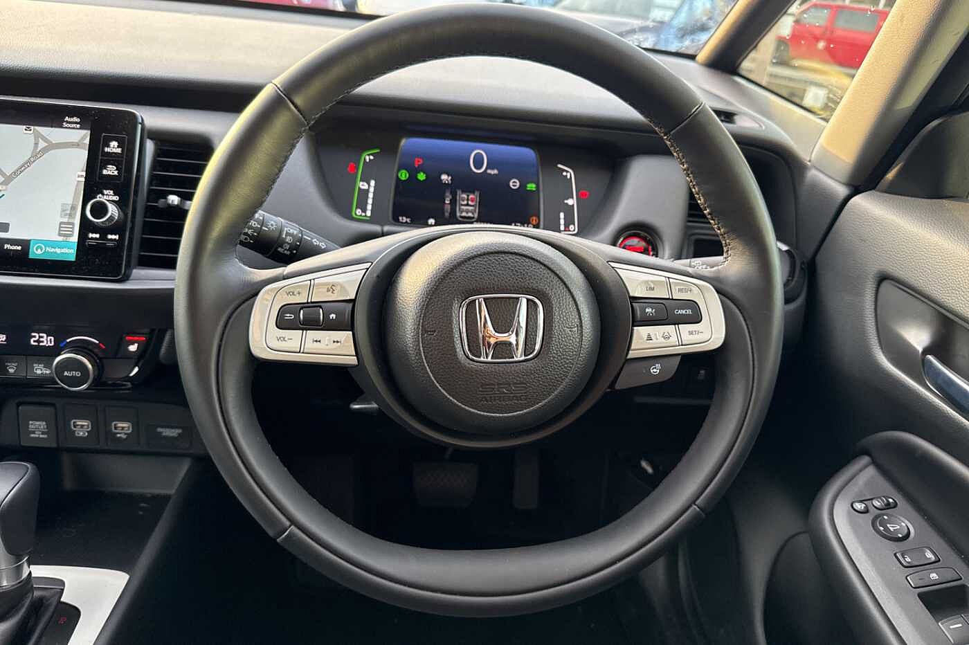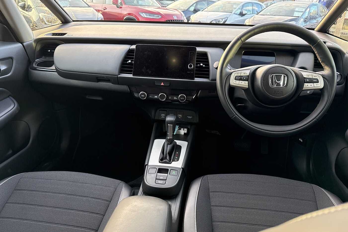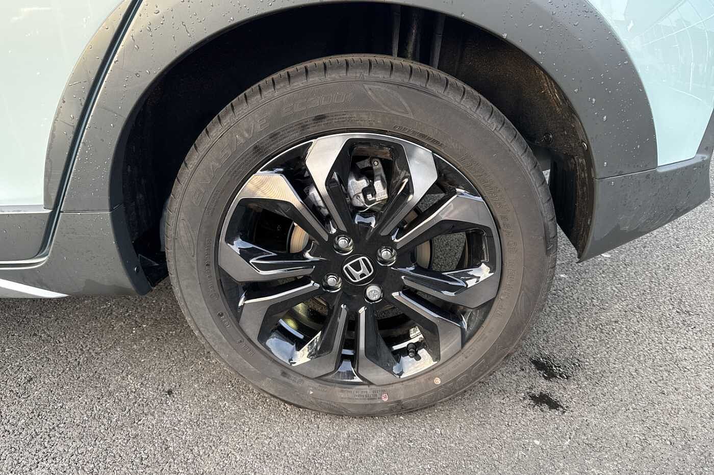 Paint - Special, Premium paint - Fjord mist, Trim - Cloth, Fabric/Water repellent cloth - Black, Exterior Features, Auto wipers, Front and rear electric windows, Privacy glass, Rear wiper, Vehicle stability assist, Black door handles, Body coloured front grille, eHEV emblem, Exclusive styling includes front and rear bumper, front fog garnish, silver fender, side sill garnish, Rear side wing doors, Roof rails, Single exhaust tailpipe, Automatic headlights with on/off timer, Coming/leaving home function, Black headlight extension, High beam assist, LED 3rd brake light, LED daytime running lights, LED front fog lights, LED Headlights, LED rear lights, Manual headlight levelling, Safety, Anti-lock braking system (ABS), Brake assist function, Brake hold function, Collision mitigation braking system, Electronic parking brake with auto hold, Hill start assist, Adaptive cruise control, Adjustable speed limiter, Agile handling assist, Driver attention monitoring system, Electric power steering wheel with variable gear ratio steering, Emergency stop signalling system, Forward collision warning, Front and rear parking sensors, Idle stop, Intelligent speed limiter, Lane departure warning system, Lane keep assist system, Low speed following, Rear view camera, Road departure mitigation, Traffic sign recognition, Aspheric door mirrors, Black door mirrors, Electric adjustable door mirrors, Electrically folding door mirrors, Heated door mirrors, 3x3 point rear seatbelts, Child locks on rear doors, Deflation warning system, Driver knee airbag, Driver SRS airbag (single stage inflation), Driver/Front Passenger airbags, Front and rear seat belt with emergency locking retractor, Front and rear side curtain airbag, Front centre airbag, Front side airbags, Passenger SRS airbag cut-off device, Rear side airbags, Whiplash lessening front headrests, Audio / Communications, Bluetooth hands free telephone connection, eCall emergency call system - ecall functionality is subject to 2G/3G network availability, Wireless apple carplay, 'Shark fin' mobile antenna, 180w Power audio system with 4 speakers, 2 USB-C connectors rear, 2x USB Front socket (1 data & 1 charge), Remote audio controls on steering wheel, Driver Convenience, Tailgate, Miscellaneous, Econ mode, Honda CONNECT with Navigation 9" touchscreen, AM/FM/DAB, Apple Carplay and Android Auto, live traffic info, Multi-information display, Traffic jam assist, Trim, Soft pad leather interior panels, 3 seat bench in 2nd row, 60/40 split rear bench seat, Driver's seat height adjustment, Front head restraints, Heated front seats, Isofix points, Magic seat flexibility system, Rear head restraints, Single front passenger seat, Interior Features, Climate control air conditioning, Cargo net hooks, Driver and front passenger seat armrests, Driver and passenger front seat pockets, Fabric/Water repellent upholstery, Front accessory power socket, Heated steering wheel, Leather gearshift knob, Leather steering wheel, Plating interior door handles, Tilt/telescopic adjustable steering wheel, Tonneau cover, Front map lights, Front/rear courtesy lights, Trunk light, Vanity mirror illumination, Sunvisors with vanity mirrors, Security, Honda super locks, Immobiliser, Mirrors and windows key fob operation, Remote central locking with 2 remote folding keys, Security alarm, Smart entry + Smart start, Wheels, 16" 3D chrome H centre cap alloy wheels, Tyre repair kit